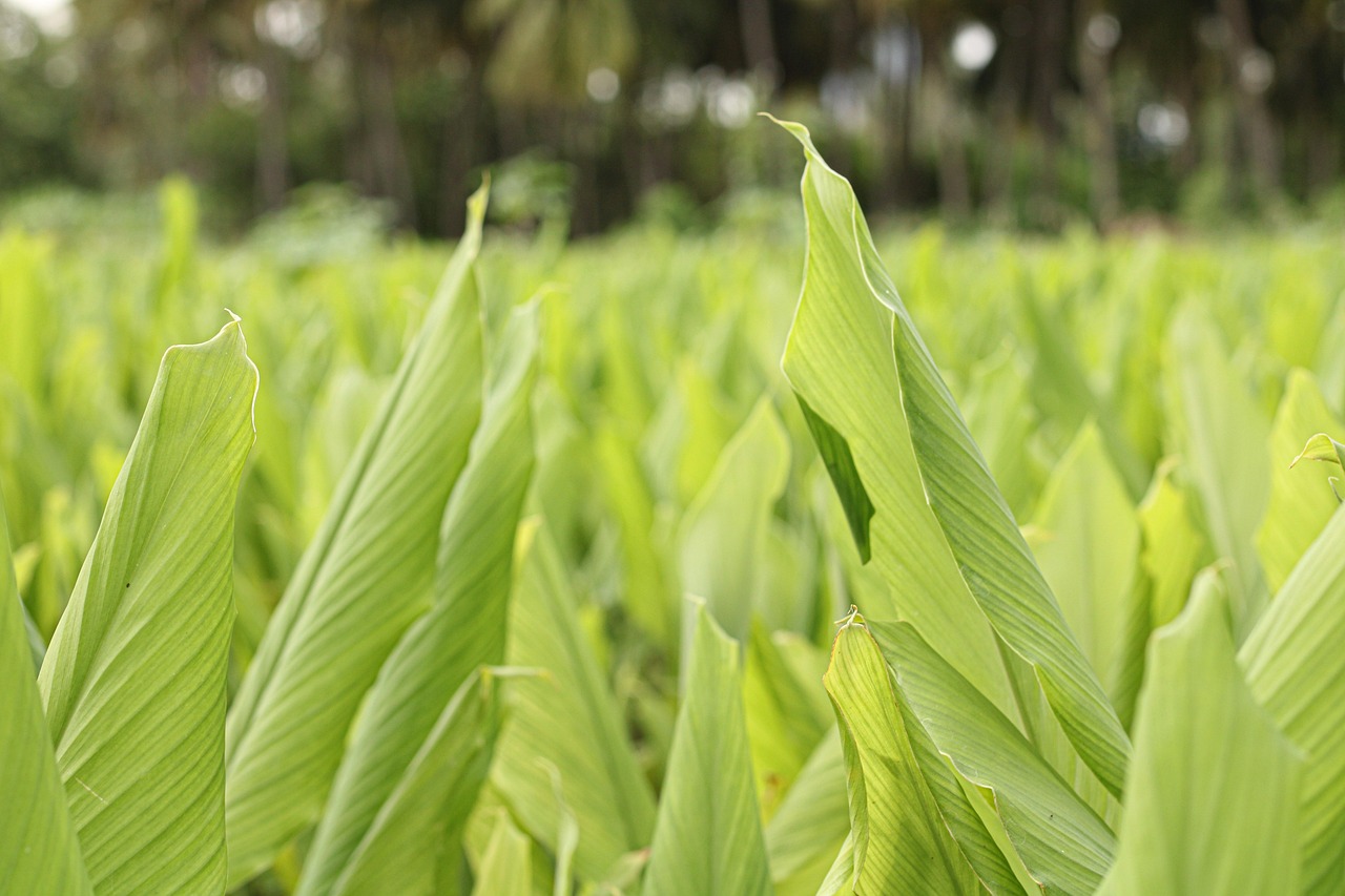 Le foglie della Curcuma sono ampie, lanceolate, con nervature evidenti, di colore verde brillante. Crescono direttamente dai rizomi, formando una densa rosetta basale. La loro consistenza è liscia e morbida al tatto, con margini interi e una forma elegante che ricorda quelle del banano, anche se di dimensioni ridotte.